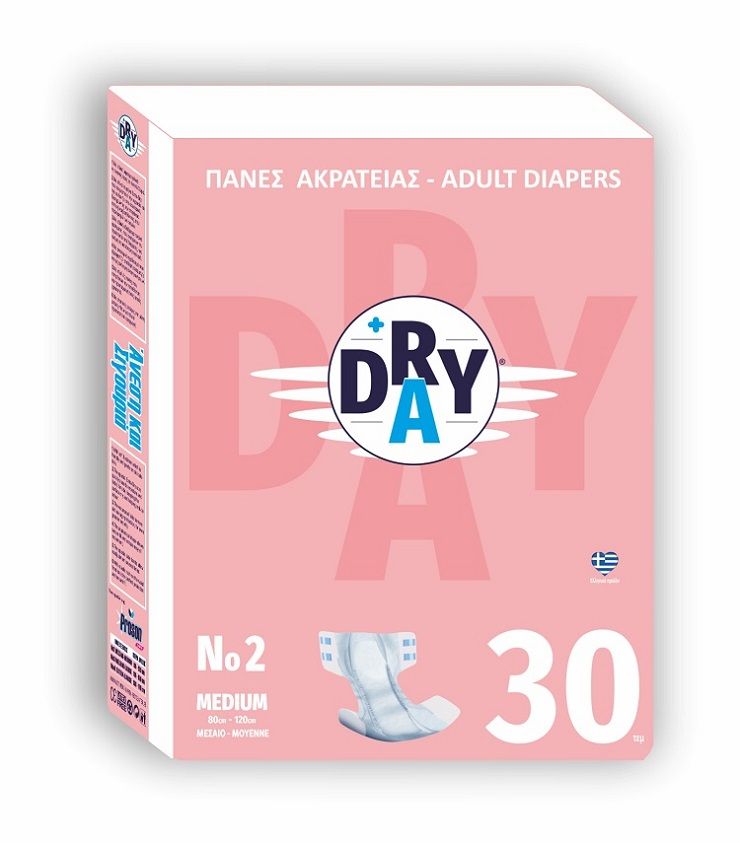 Οι πάνες ενηλίκων DryDay έχουν σχεδιαστεί για όλους που υποφέρουν από μέτρια και σοβαρή ακράτεια. Ο απορροφητικός τους πυρήνας είναι κατασκευασμένος από ένα μαλακό χνούδι κυτταρίνης αναμεμιγμένο με υπεραπορροφητικά πολυμερή, τα οποία συγκρατούν τα υγρά. Το αδιάβροχο εξωτερικό φύλλο εγγυάται προστασία από διαρροές υγρού, το μη υφασμένο εσωτερικό φύλλο το οποίο έρχεται σε επαφή με το σώμα, εγγυάται άνεση κατά τη χρήση. Η φόρμα της πάνας έχει επανατοποθετημένες ταινίες. Κατάλληλες για όλες τις ώρες.