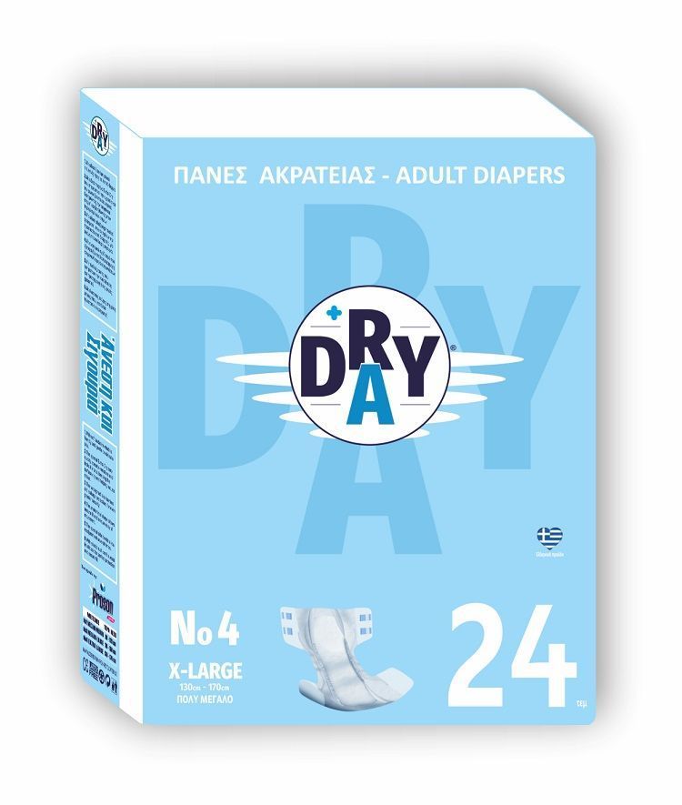 Η πάνα ενηλίκων DRY DAY διαθέτει τον ειδικό πυρήνα,που στερεοποιεί την υγρασία και την φυλακίζει στον εσωτερικό. Τα ειδικά αδιάβροχα πλαϊνά φράγματα ενισχύουν την προστασία από διαρροές για ακόμη μεγαλύτερη σιγουριά. Ο ανατομικός σχεδιασμός της πάνας εξασφαλίζει σταθερή εφαρμογή και μεγαλύτερη άνεση κινήσεων. Οι πλαϊνές ταινίες επιτρέπουν την τοποθέτηση και προσαρμογή όσες φορές χρειαστεί. Και το νεο υπέρ-απαλό μη υφασμένο υλικό (non-woven) εξασφαλίζει την βέλτιστη άνεση και την αίσθηση κανονικού εσωρούχου.